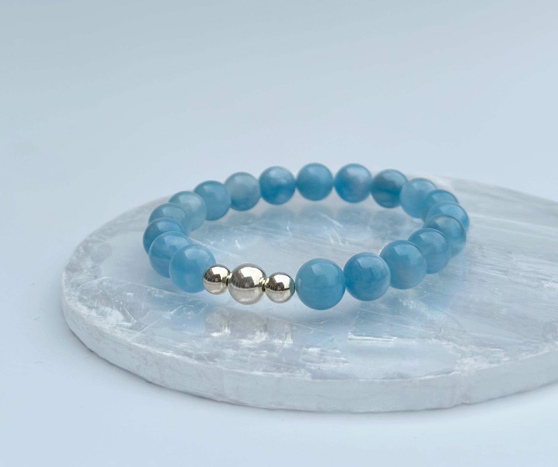 Approximately 10mm Aquamarine beads with 925 Sterling Silver findings. Lovingly handmade using clear stretchy elastic.