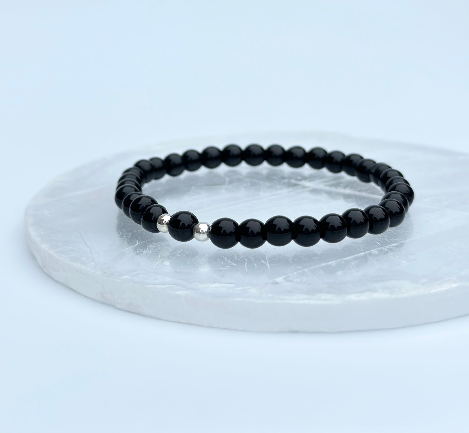Approximately 6mm Black Obsidian beads with 925 Sterling Silver findings. Lovingly handmade using clear stretchy elastic.