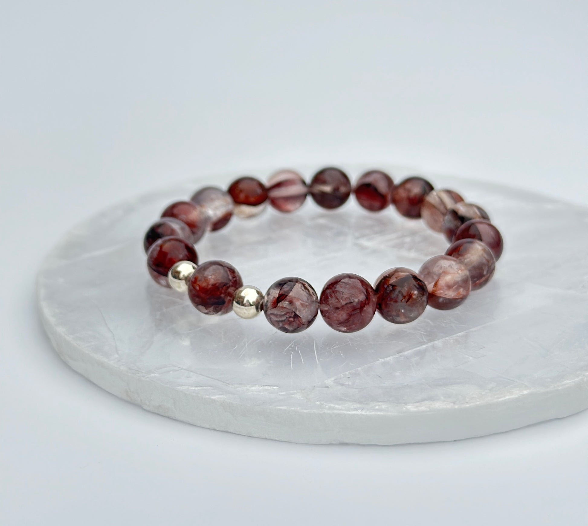 Approximately 10mm Fire Quartz beads with 925 Sterling Silver findings. Lovingly handmade using clear stretchy elastic.