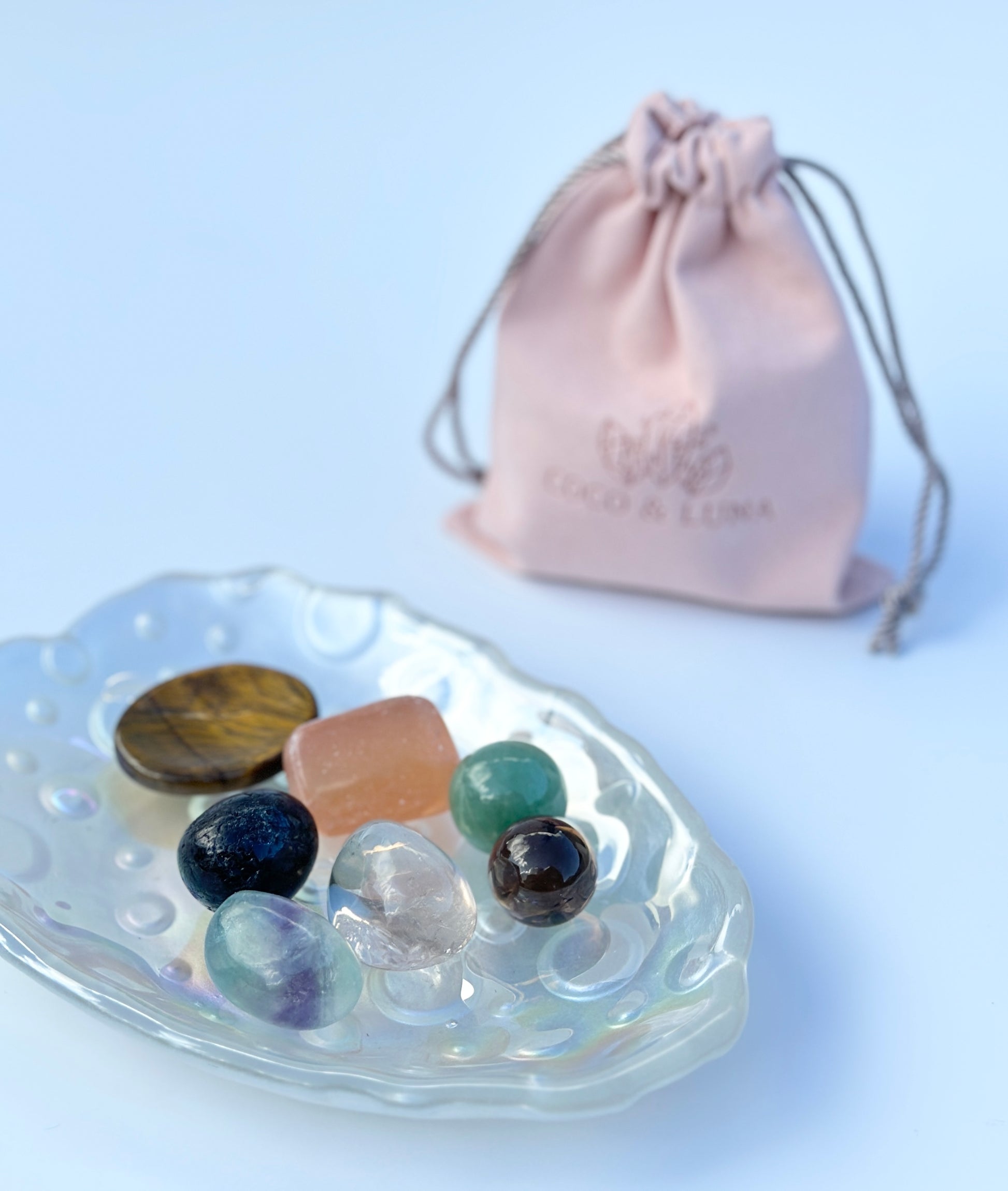 What's included? A beautiful suede pouch, allowing you to effortlessly carry these precious crystals with you, wherever you go. Inside the pouch is one worry stone, five tumblestones and 1 miniature carving. Our kits allow you to keep the power of these stones close at hand and experience their positive influence throughout your day.
