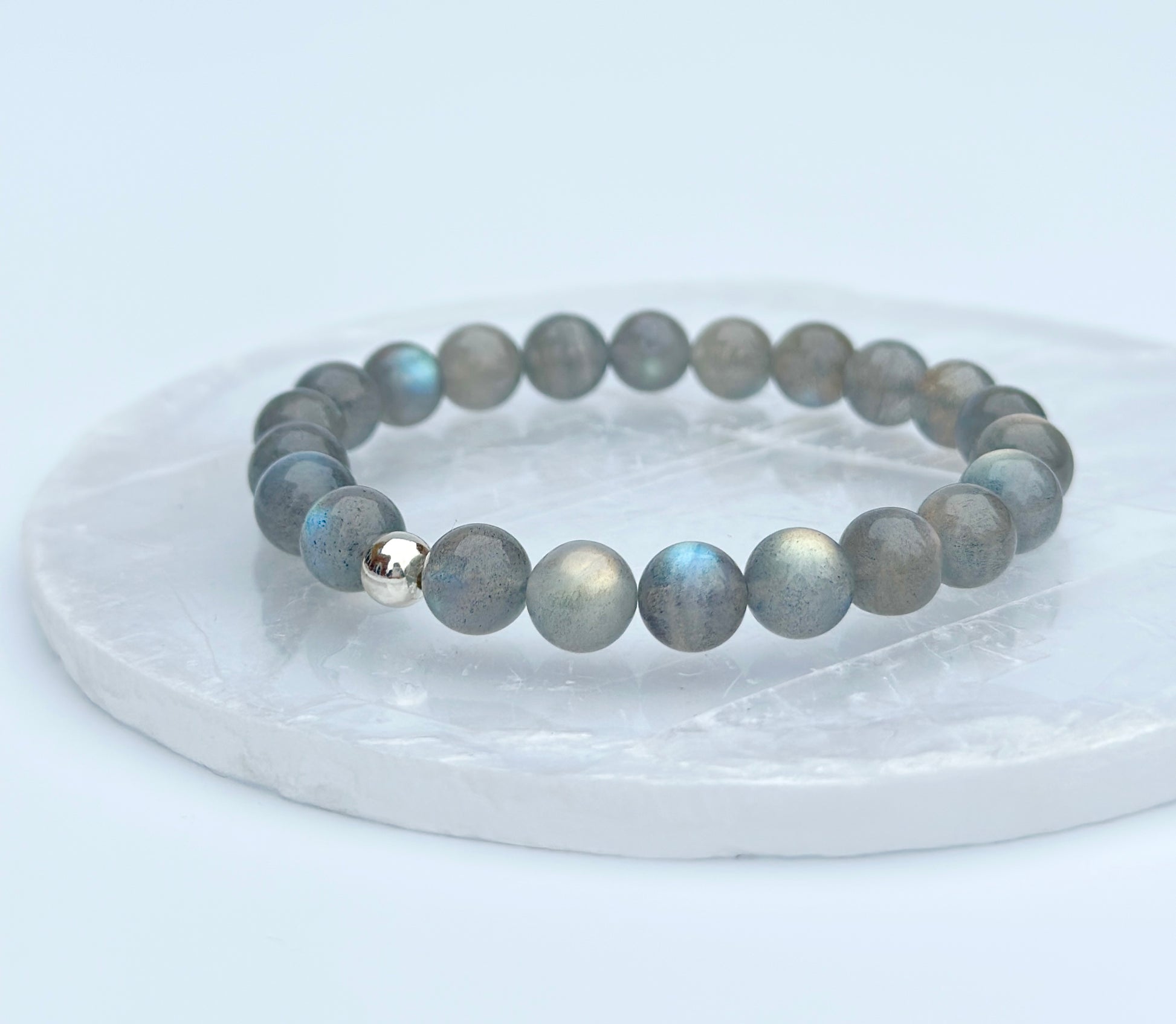 Approximately 7-8mm Labradorite beads with 925 Sterling Silver findings. Lovingly handmade using clear stretchy elastic.