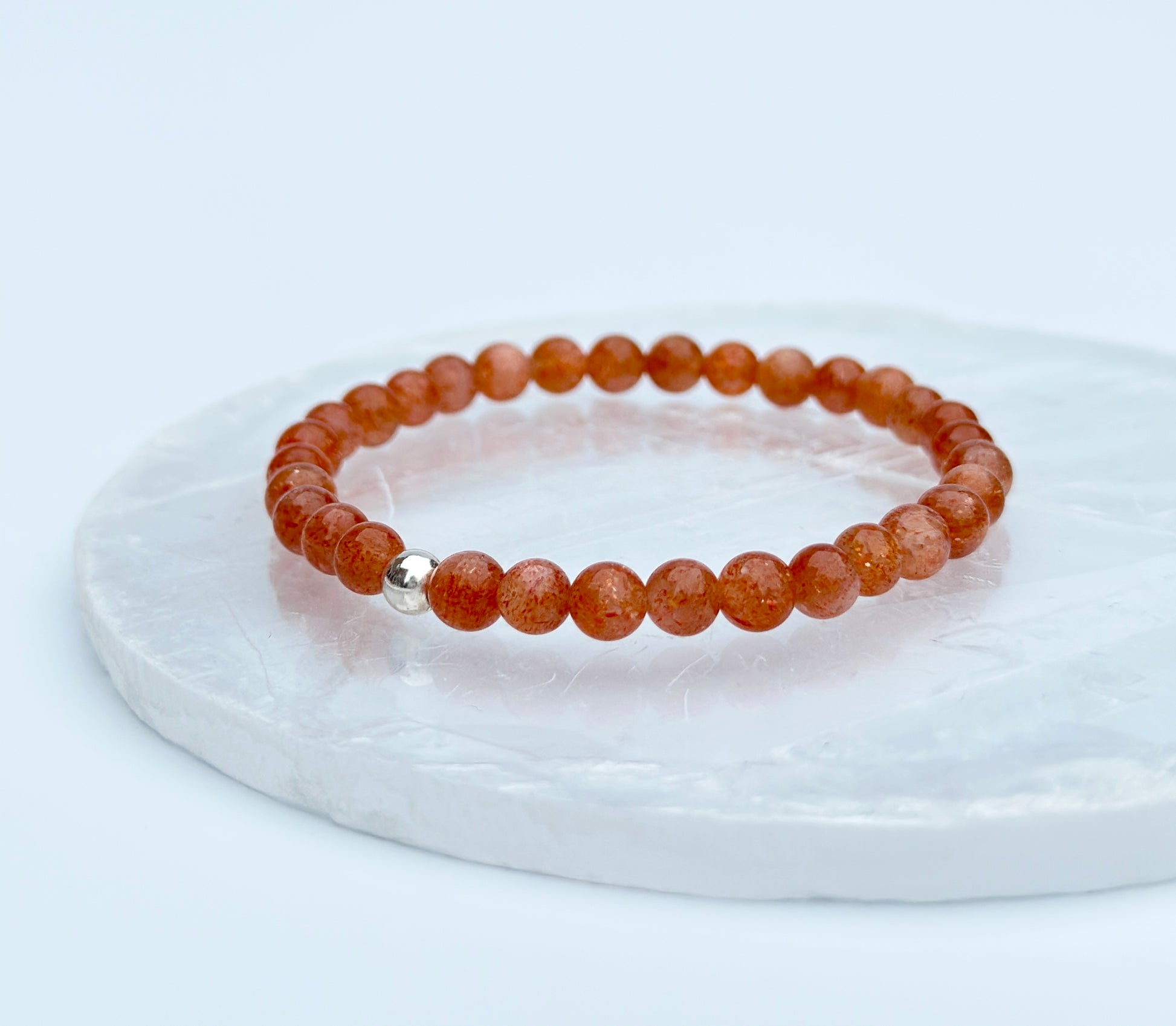 Approximately 6.4mm Sunstone beads with 925 Sterling Silver findings. Lovingly handmade using clear stretchy elastic.