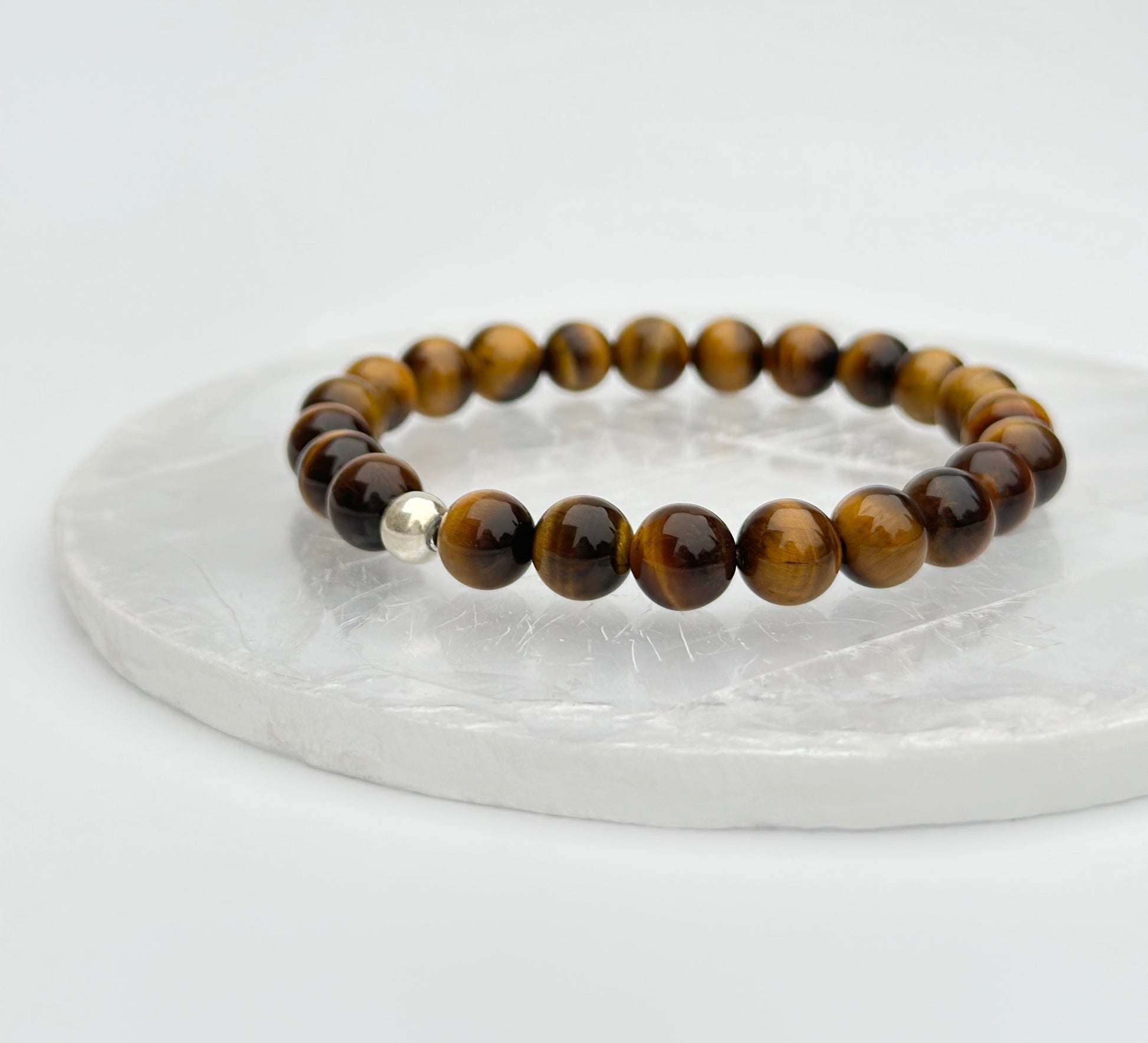 Approximately 8.1-8.4mm Tiger Eye beads with 925 Sterling Silver findings. Lovingly handmade using clear stretchy elastic.